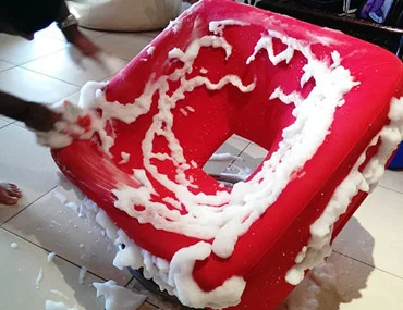 A specialized disinfectant shampoo is applied to the surface to break down dirt and contaminants.